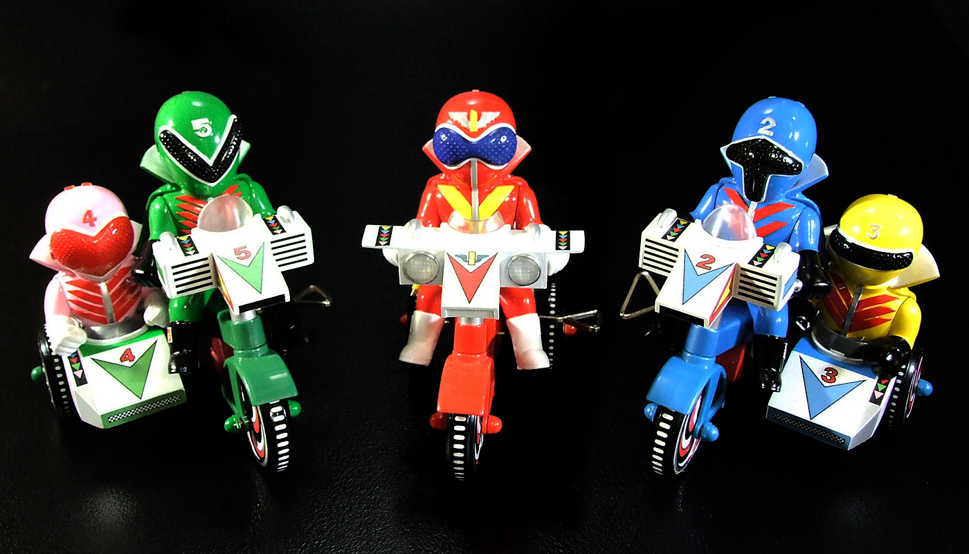 「秘密戦隊ゴレンジャー」に登場するキャラクターたちが、懐かしくレトロなゼンマイ式三輪車に乗ったソフビフィギュアで登場!!