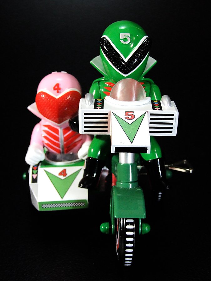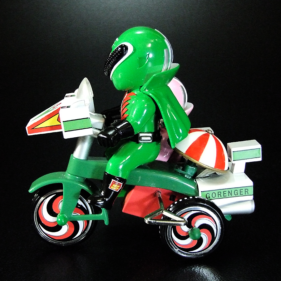 「秘密戦隊ゴレンジャー」に登場するキャラクターたちが、懐かしくレトロなゼンマイ式三輪車に乗ったソフビフィギュアで登場!!