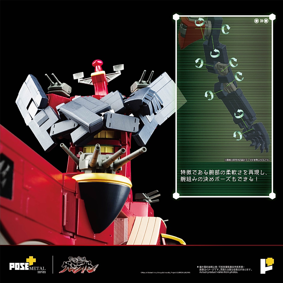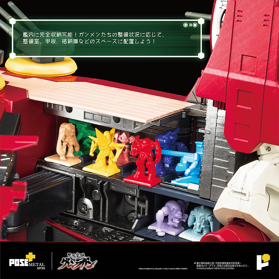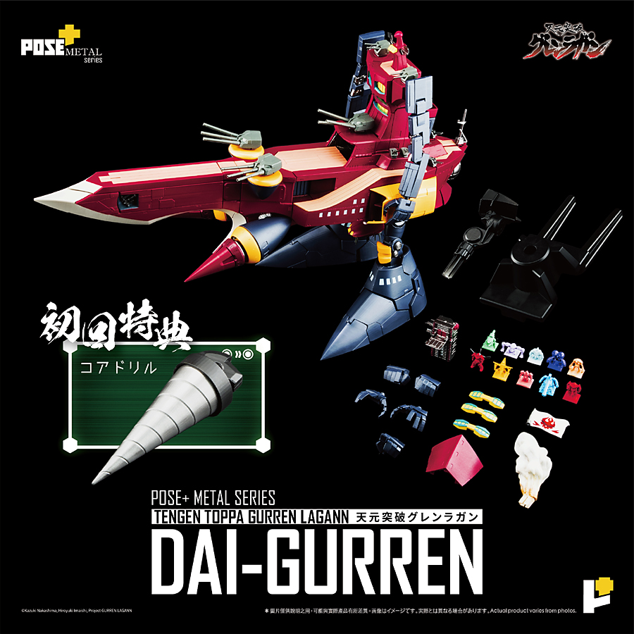 セット内容:ダイグレン本体、グレン団旗、ダイグレン用表情パーツ×3種、開き手A、開き手B、天元突破ポーズ用ハンド、船体カバーパーツ、台座セット、ダイグレン団ミニフィギュア×10種、煙突エフェクト、コアドリル(初回特典)