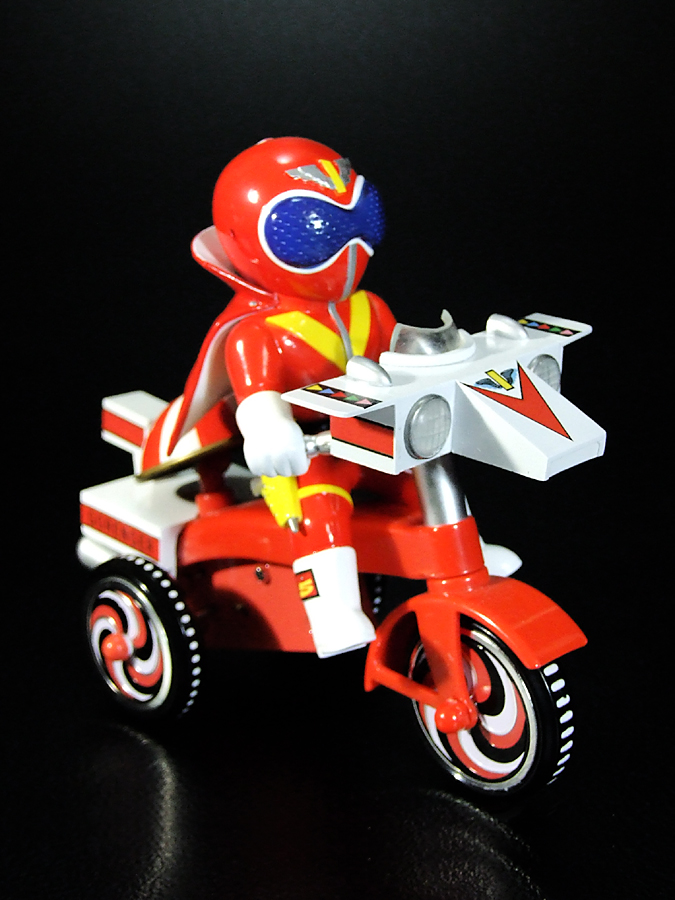 「秘密戦隊ゴレンジャー」に登場するキャラクターたちが、懐かしくレトロなゼンマイ式三輪車に乗ったソフビフィギュアで登場!!