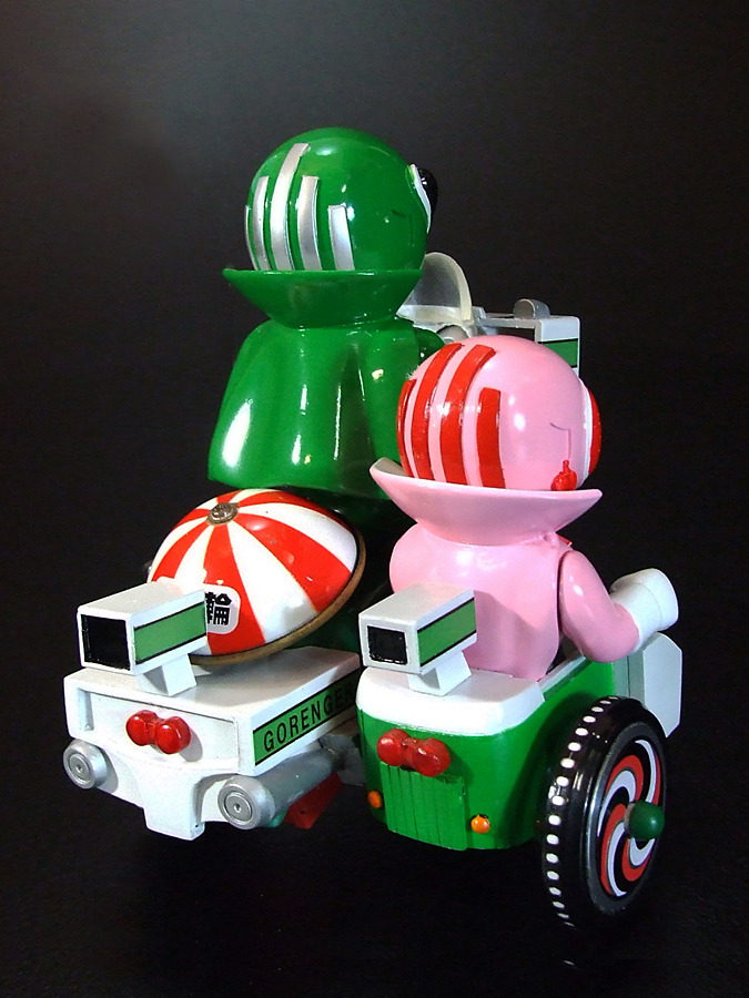 三輪車の本体、ホイールやおりん等もそれぞれのキャラクター用のカラーリング、そしてカウルやマフラーにライトパーツなど細かい造形がファンを魅了します。三輪車はゼンマイを回し走行が可能。車輪も可動。おりん部分がチリンチリンと音が鳴ります。