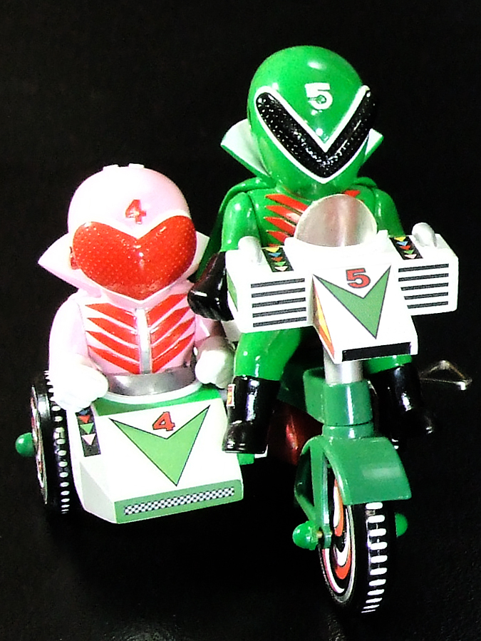 「秘密戦隊ゴレンジャー」に登場するキャラクターたちが、懐かしくレトロなゼンマイ式三輪車に乗ったソフビフィギュアで登場!!